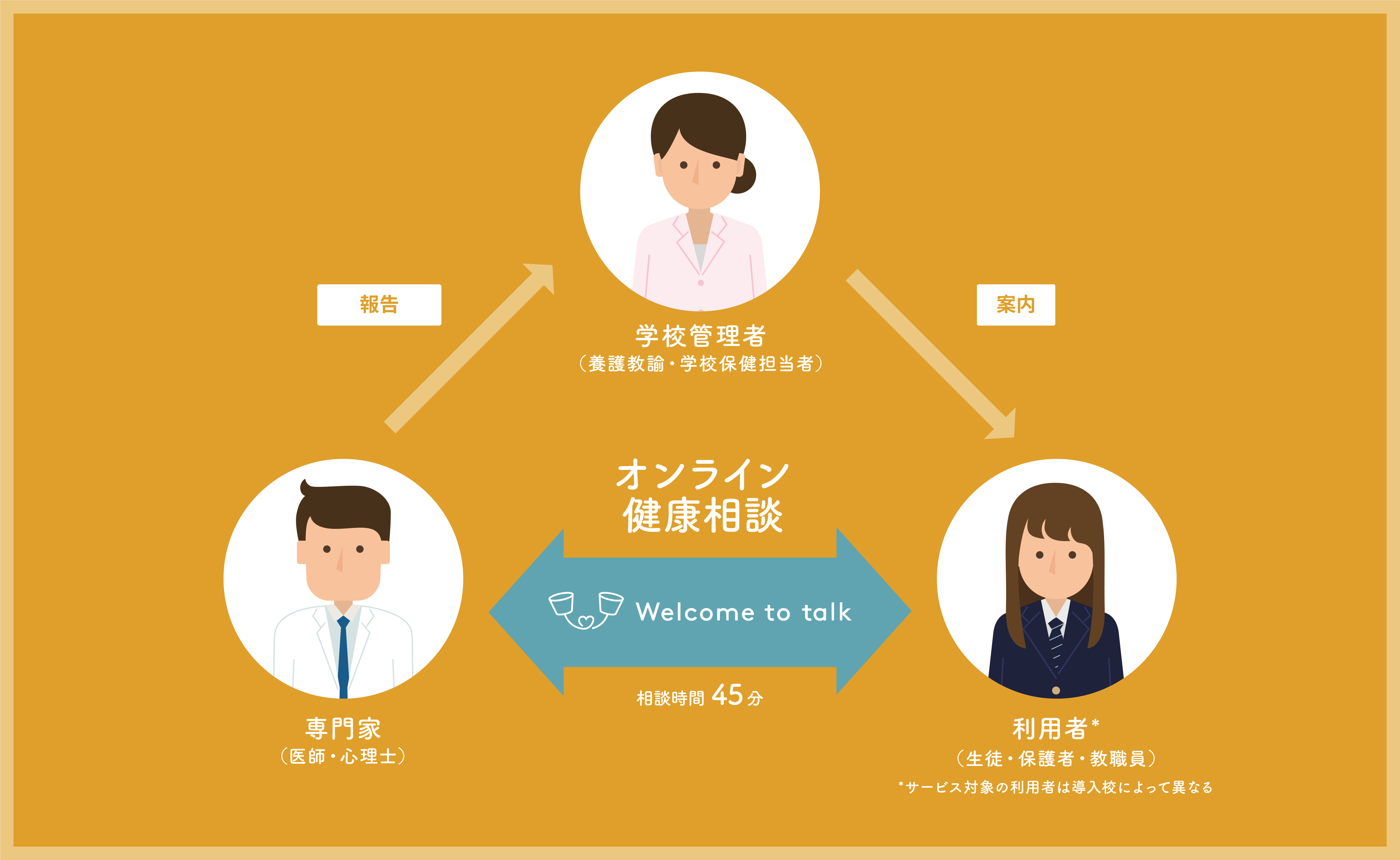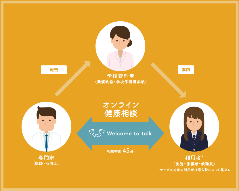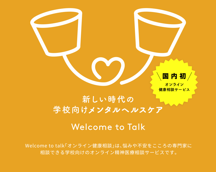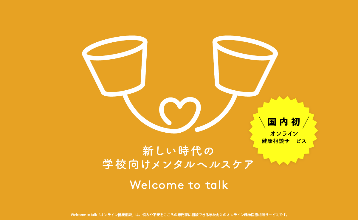 Welcome to talk は⼦どもたちを⾒守る「保護者」「教職員」へのサポートがこころの問題の根本的な解決につながると考え、利⽤者は、導⼊校の⽣徒に加え、保護者や教職員も対象としています。