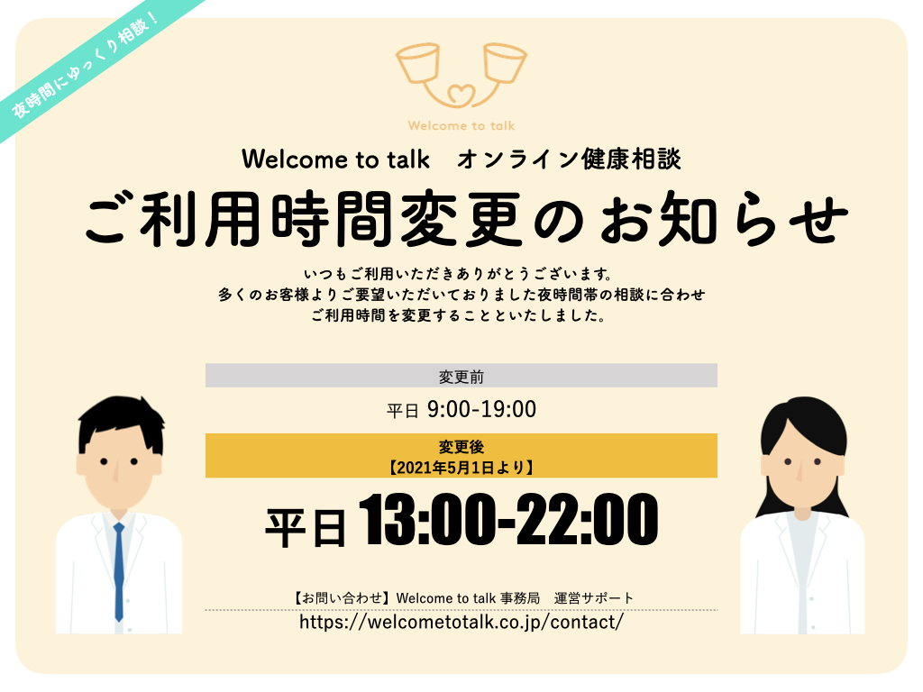 2021年5月1日より、多くの学校関係者様よりご要望をいただいておりました「オンライン健康相談」の夜利用に関する声を反映させ、サービス利用時間を変更します。