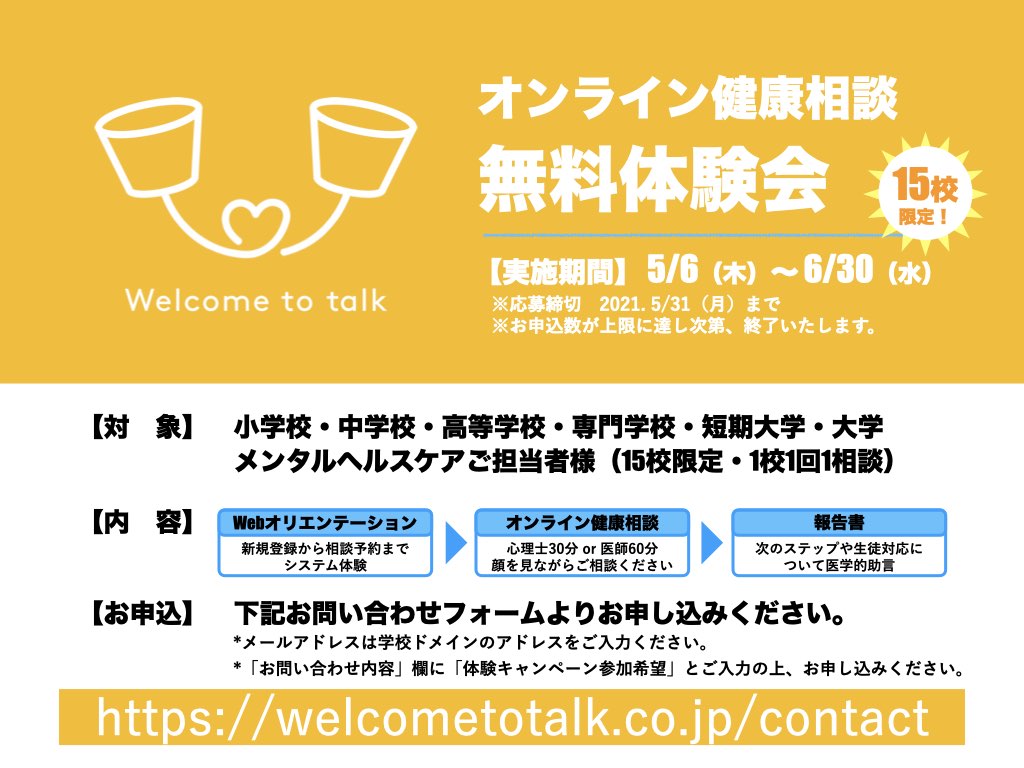 Welcome to talkでは、メンタルヘルスケア対策ご担当の学校教職員のみなさまを対象に、オンライン健康相談体験会を実施します(先着15校限定)。